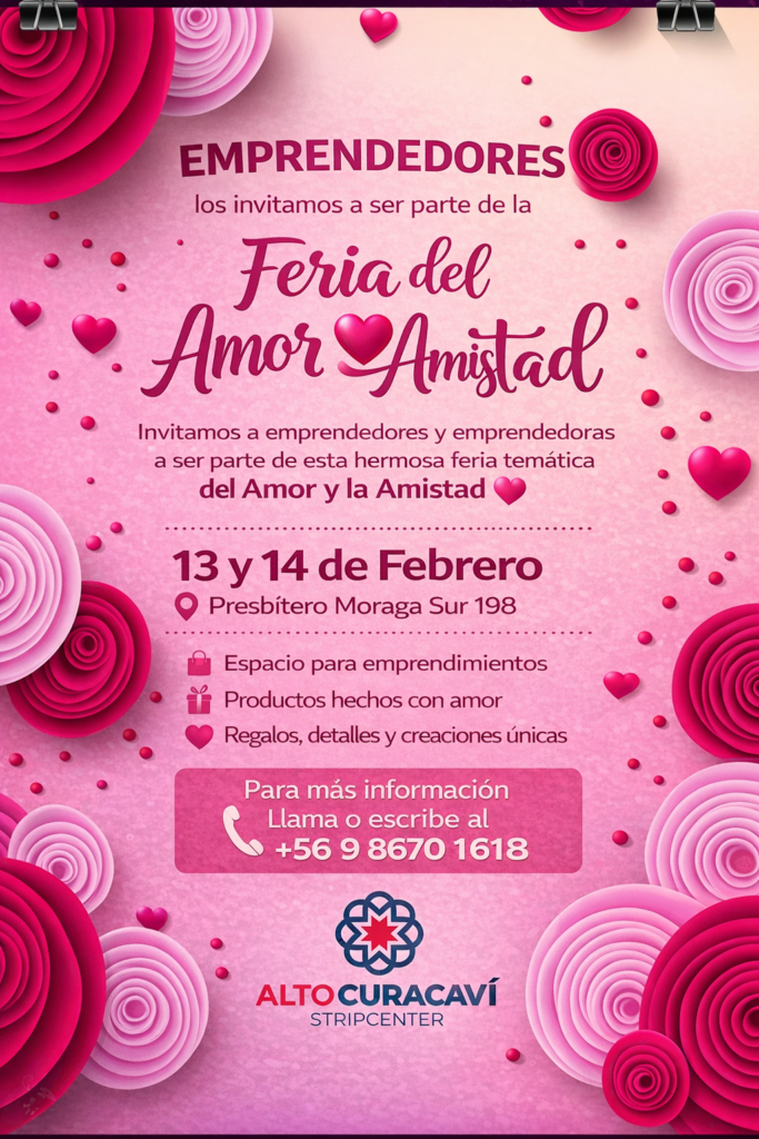 La feria se realizará los días 13 y 14 de febrero, en el Alto Curacaví Stripcenter, ubicado en Presbítero Moraga Sur 198, y busca convertirse en un punto de encuentro para quienes ofrecen productos únicos, originales y cargados de significado, ideales para regalar en estas fechas tan especiales.